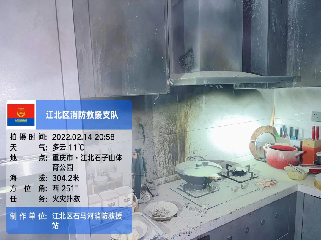 2022年2月14日,重庆市江北区石子体育公园附近一住户家中发生火灾, 到场核实为该住户忘记关火导致厨房起火。