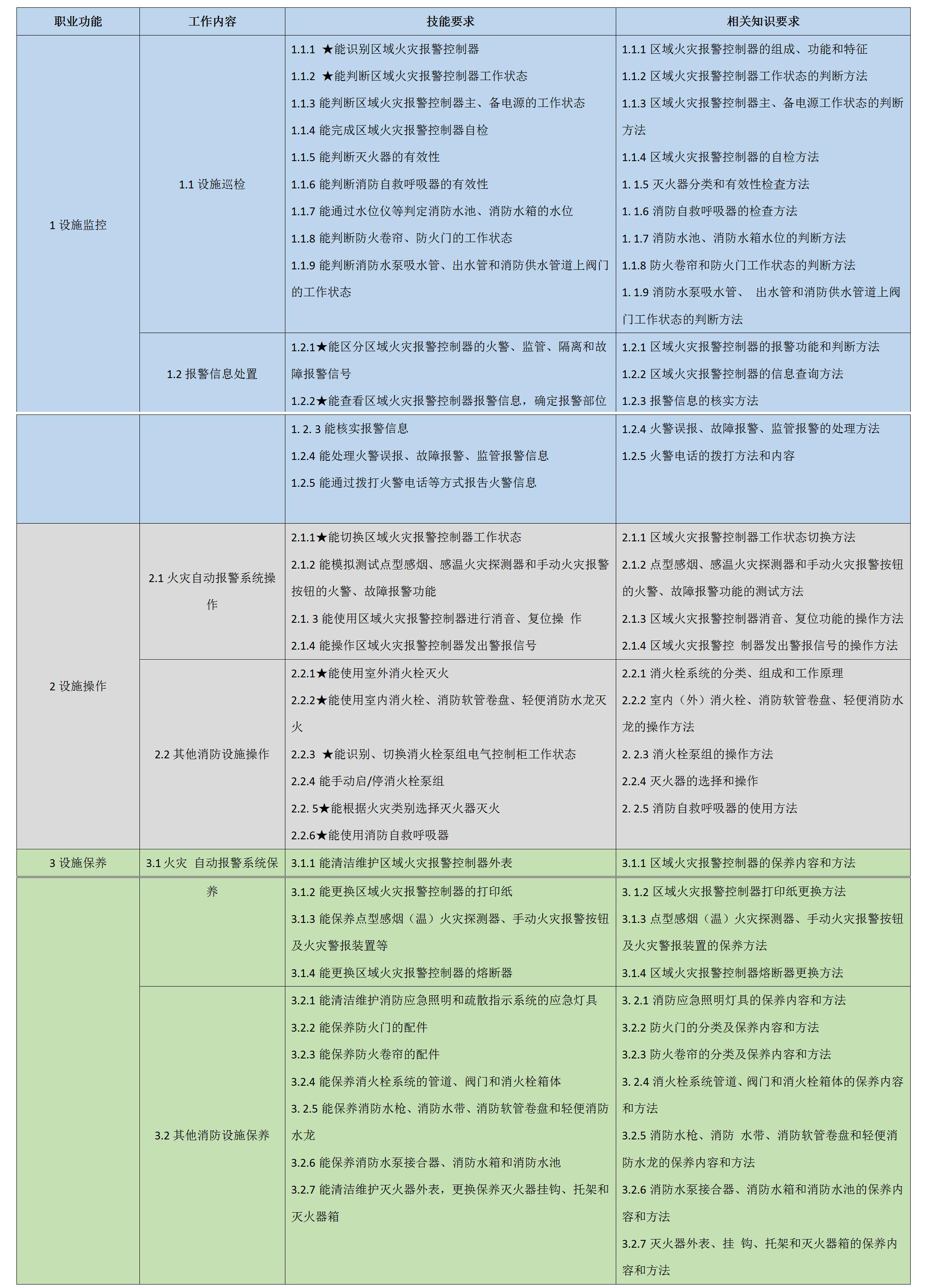 消防设施监控操作职业方向考核1、2、3项职业功能内容,共40操作要求,13项关键技能;