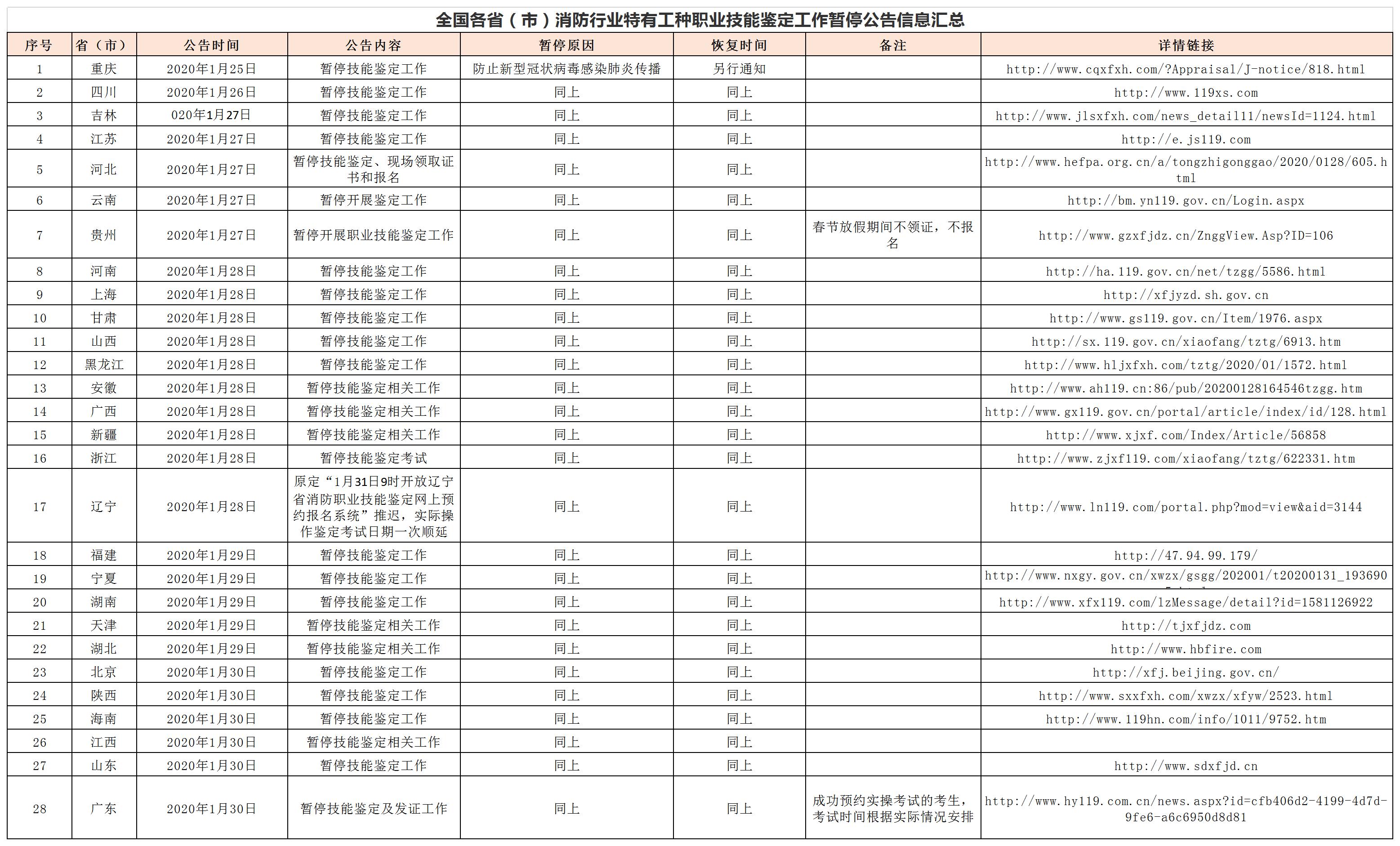 全国各省(市、区)消防行业特有工种职业技能鉴定工作暂停公告信息汇总