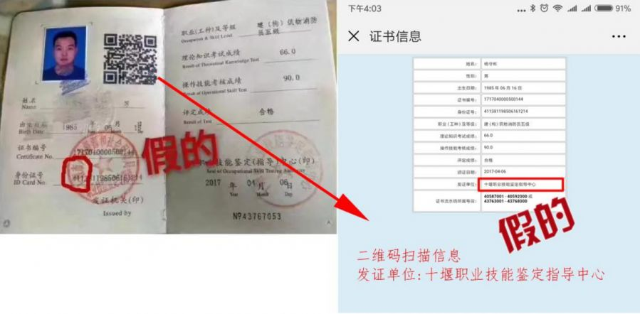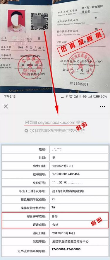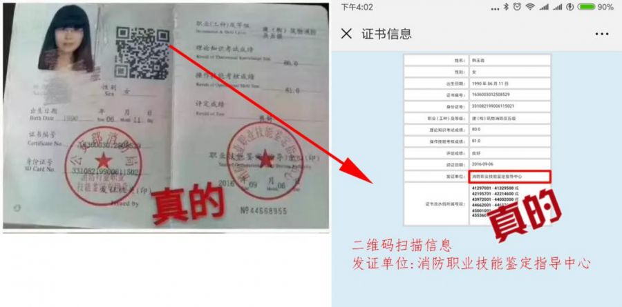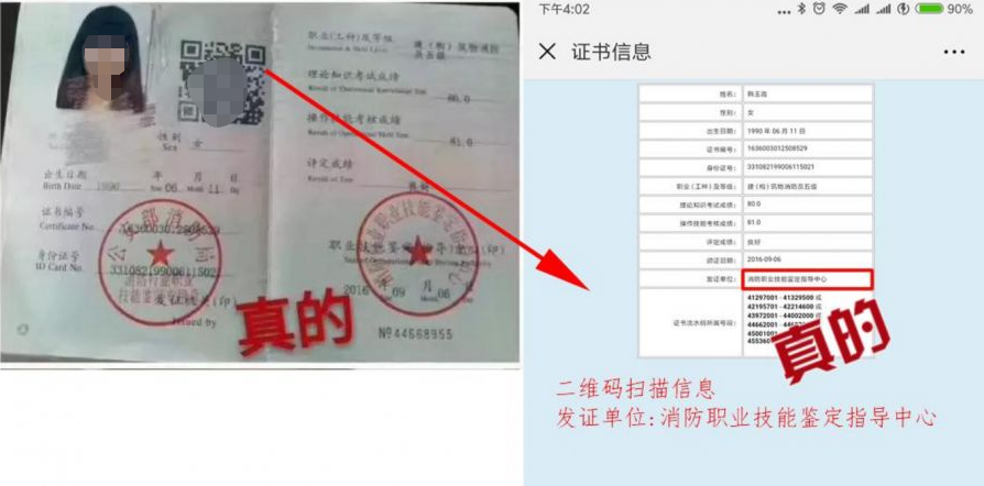 ⑵“真”中带假: 网上可查,集体操作。这种假证证件本身不是个人制作,通过XX省或XX市非消防行业鉴定中心制作、 上传,上网可以查询到,这就是对方所说的"真"。假就假在没有"公安部消防局"和" 消防行业特有工种职业技能鉴定指导中心"的印章,而是 XX 省或 XX 市冠名的印章。这种证一眼便知。