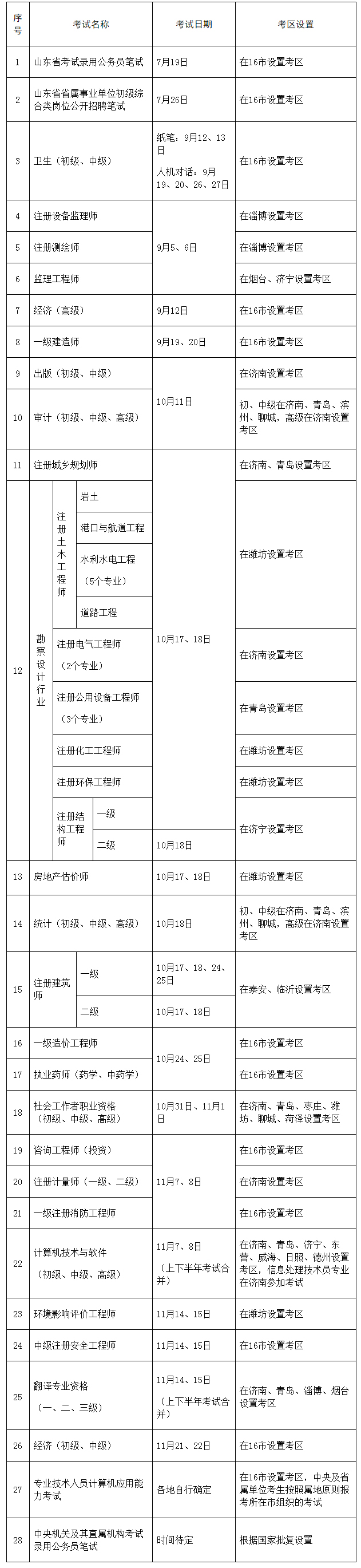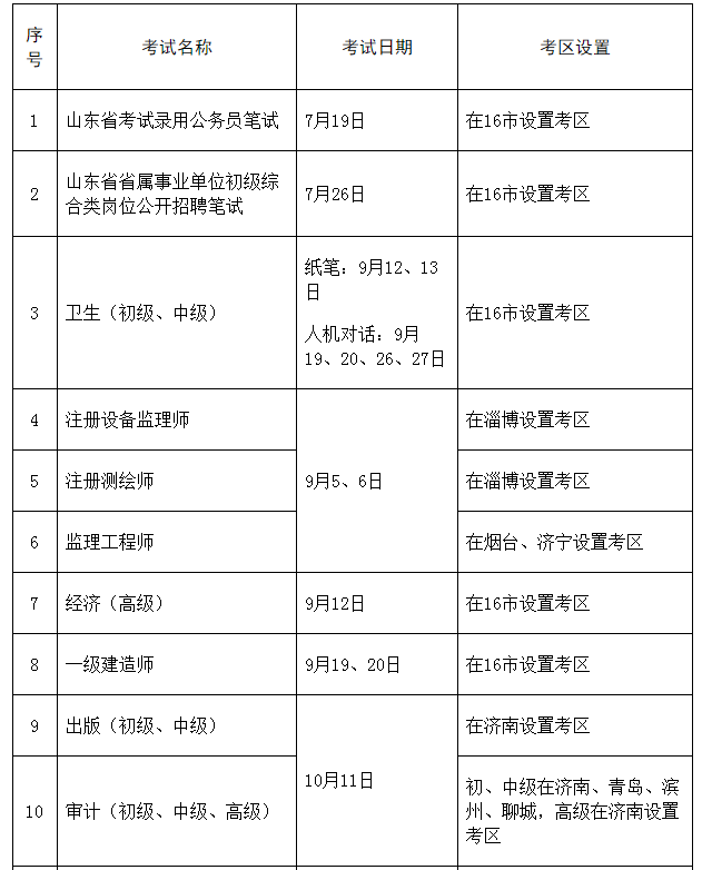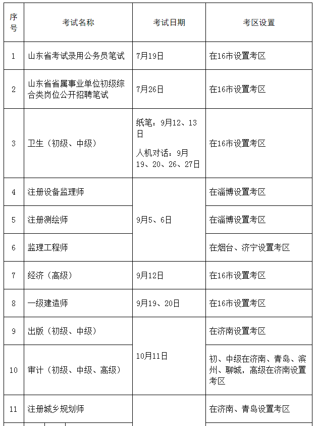 6月16日,山东省人力资源和社会保障厅发布《印发山东省2020年度人事考试计划的通知 》,通知中明确了 各项考试时间和考取设置安排,其中 一级 注册消防工程师考试将于11月7、8日进行,并 在16个市设置考区 。