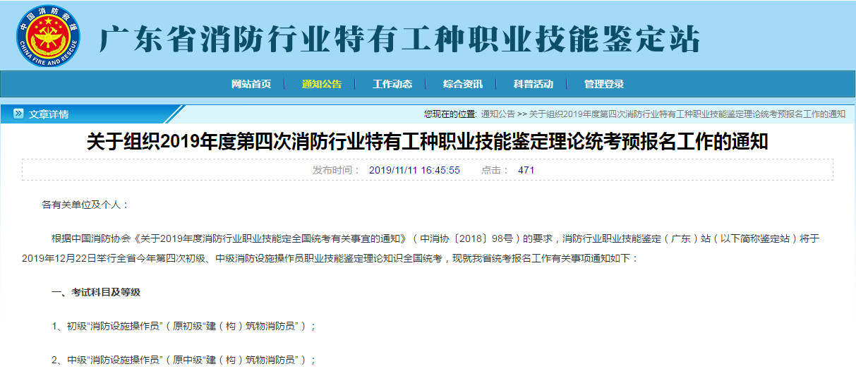 11 月 11 日,广东省 消防行业特有工种职业技能鉴定站发布了《 关于组织 2019 年度第四次消防行业特有工种职业技能鉴定理论统考预报名工作的通知 》,鉴定站(广东)将于 2019 年 12 月 22 日举行全省今年第 四次初级、中级 消防设施操作员职业技能鉴定理论知识全国统考。