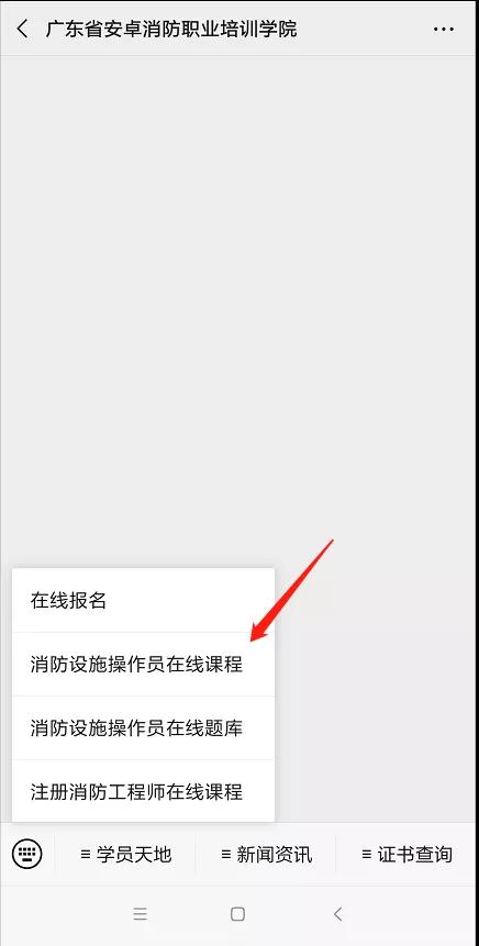 首次进入在线课程步骤: 关注“ 广东省安卓 消防职业培训学院 ”公众号 → 学员天地 → 消防设施操作员在线课程 → 我的 → 兑换中心 → 填写邀请码 → 立即兑换 → 查看课程 → 选择课程 → 进入回看