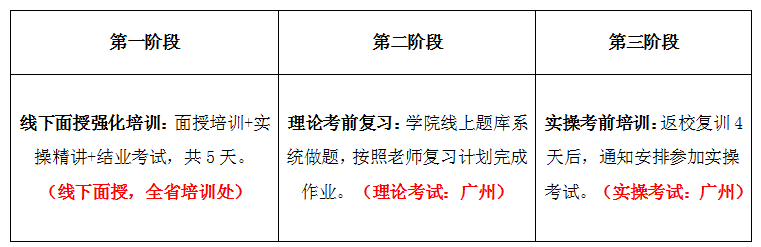 ①填写报名表→报名确认→缴费开票→选择线下班次→进入微信班群→参加面授课程→通过结业考试→颁发结业证书→开通线上题库练习→老师在线辅导→考前备考→参加全国理论统考→实操培训考试→领取资格证书。