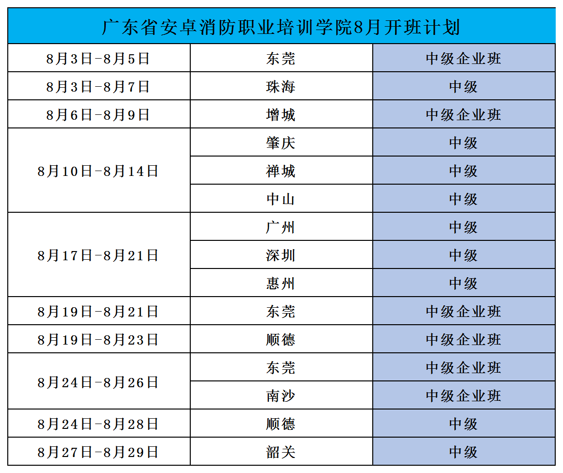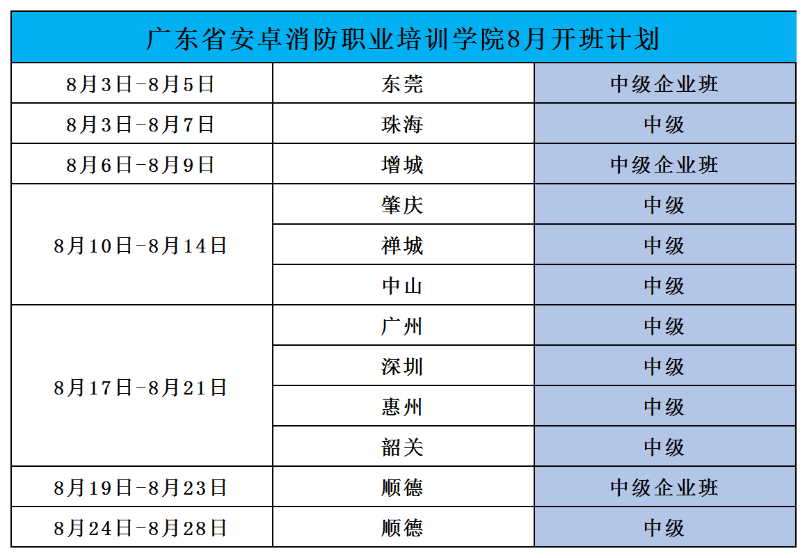 关于举办广东省第三季度8月份消防设施操作员(建构筑物消防员)培训考证,持证上岗的开班通知