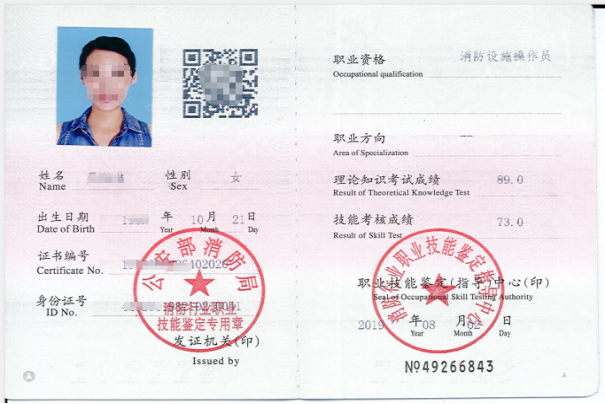 3、学员在考取全国通用的“消防设施操作员”《职业资格证书》前,在一定期限内可凭我院《结业证》为持证上岗证书的凭证,接受当地公安消防和安监部门的检验。考核合格后由国家人力资源与社会劳动保障部、应急部消防局及消防行业鉴定指导中心联合颁发职业资格证书。