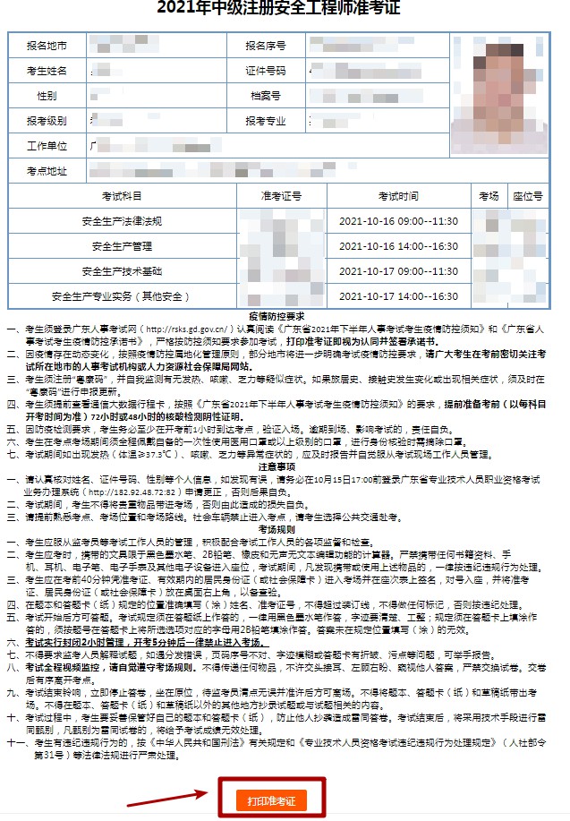 注意!今天开始广东省考生可以打印2021年中级注册安全工程师考试准考证啦!