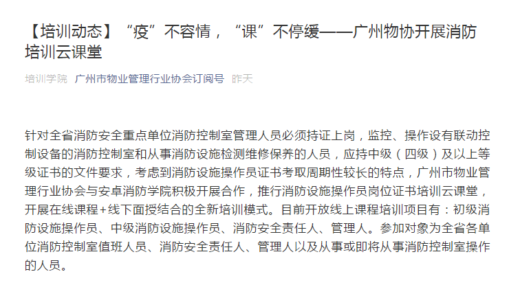 广州市物业管理行业协会与广东省安卓消防学院(我院)共同开展 消防职业培训云课堂。采用线上课程+线下面授的全新培训模式,在疫情防控期间,为奋战在前线的物业学员带来高效便捷的 消防培训课程,共同战“疫”,我们一起行动!