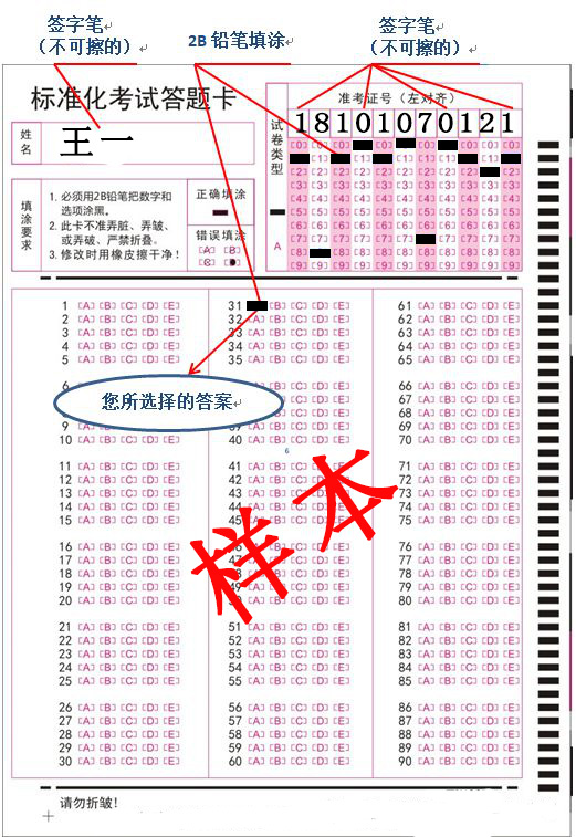 以答题卡为例,第一要把考号找准、涂准。首先要对准考证号数字用黑色钢笔或圆珠笔准确填写,不能错位,然后再将每位考号对应的“0—9”中正确选择一项用2B铅笔涂黑。第二要把考题题号选准。考试题与答题卡是分开的,在答题涂写时一定要找准试题题号和对应的答题题号。第三要把选择项找准、涂准。对于 “A.B.C.D”四个选择项要做到答哪项,涂哪项。