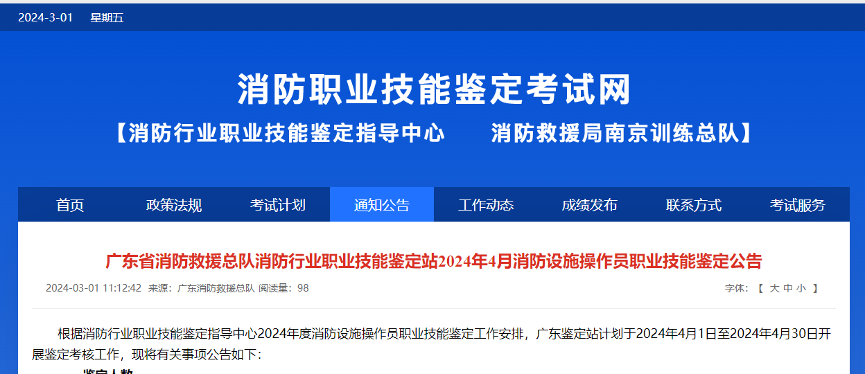 广东省消防救援总队消防行业职业技能鉴定站2024年4月消防设施操作员职业技能鉴定公告