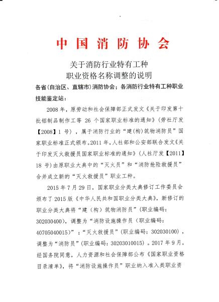 根据《中华人民共和国职业分类大典》, “ 建(构)筑物消防员”职业调整为“ 消防设施操作员”。