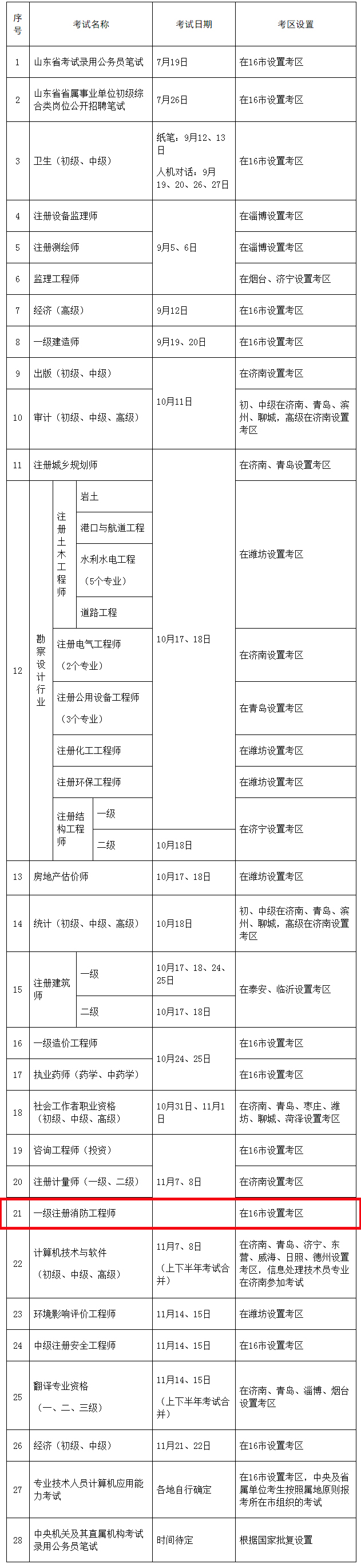 6月16日,山东省人力资源和社会保障厅发布《印发山东省2020年度人事考试计划的通知 》,通知中明确了 各项考试时间和考取设置安排,其中 一级 注册消防工程师考试将于11月7、8日进行,并 在16个市设置考区 。