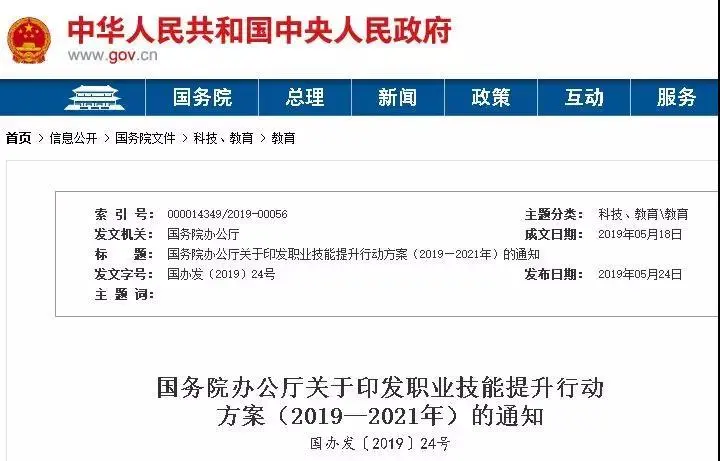 根据2019年,国务院印发《职业技能提升行动方案(2019—2021年)》: