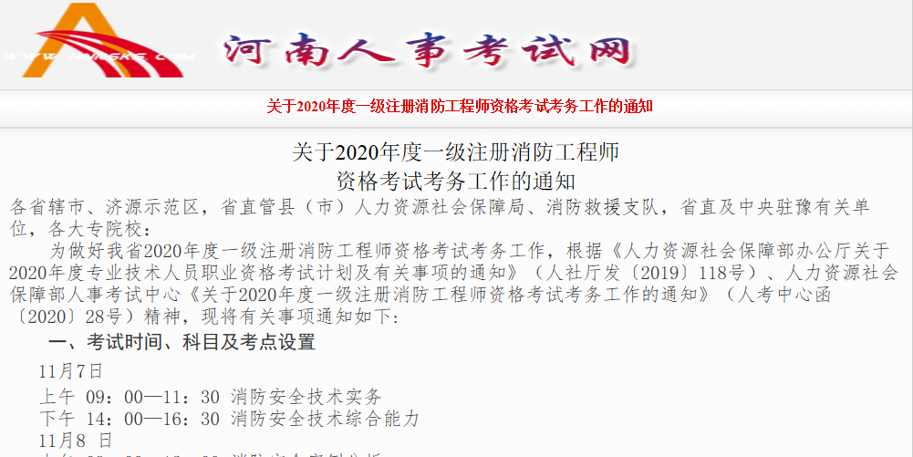 河南:关于2020年度一级注册消防工程师 资格考试考务工作的通知