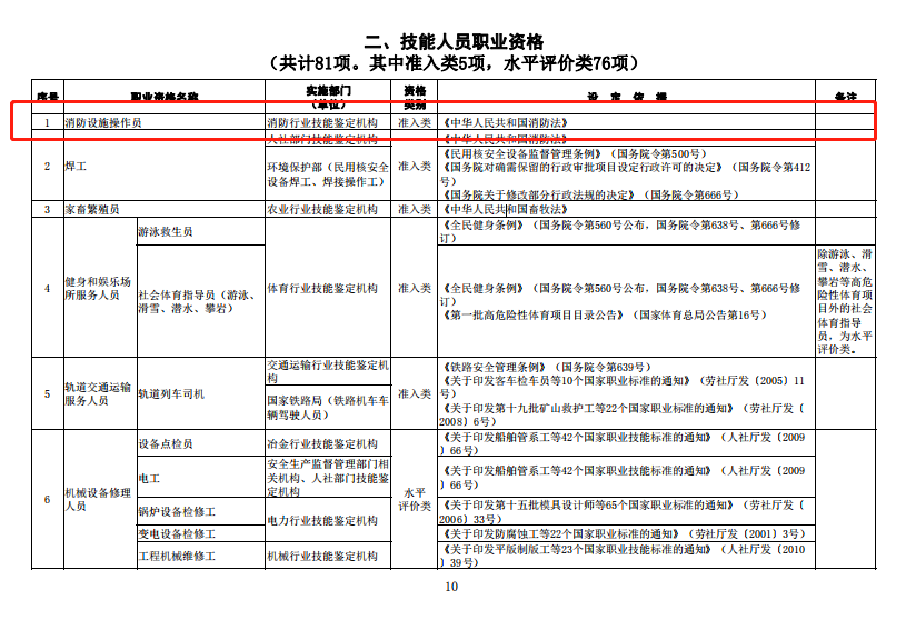 《国家职业资格目录清单》消防设施操作员”在技能人员职业资格“准入类”中居首位