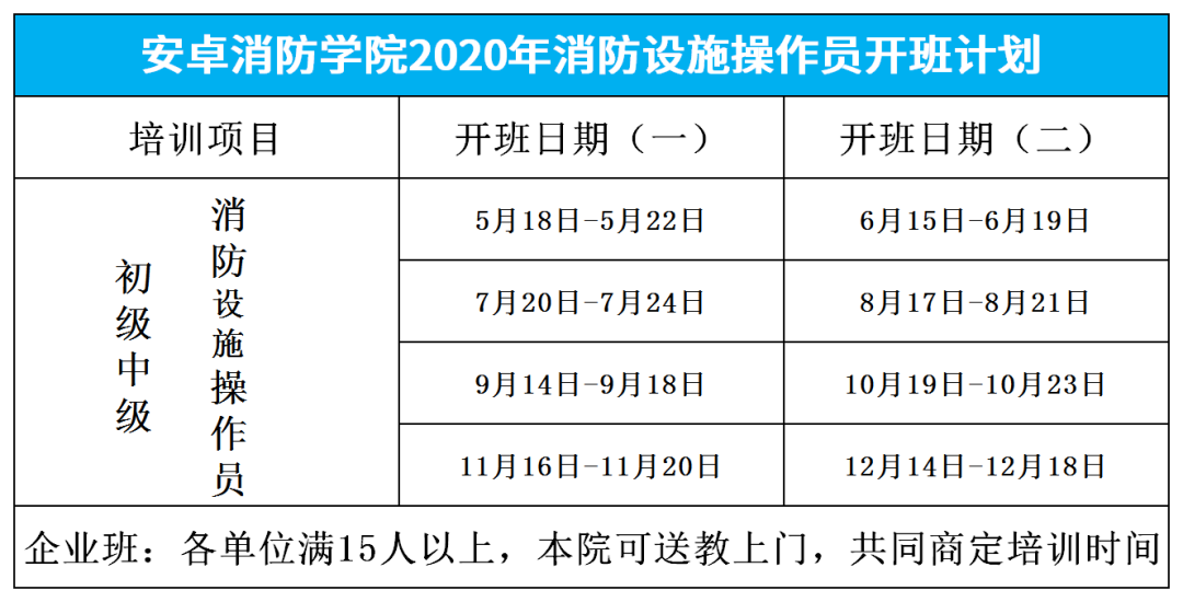 广东省安卓 消防职业培训学院第二季度5月 消防设施操作员(建构筑物消防员)培训班即将开启,因2020年度消防政策大改革,教材改版、培训内容增加、题库更新、难度增大,我院特采取“线上学习+线下面授”结合的全新培训模式,疫情期间免费通过线上学习+题库做题,老师在线辅导,提升培训质量,确保高效通过率。