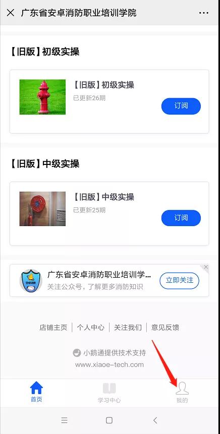 首次进入在线课程步骤: 关注“ 广东省安卓 消防职业培训学院 ”公众号 → 学员天地 → 消防设施操作员在线课程 → 我的 → 兑换中心 → 填写邀请码 → 立即兑换 → 查看课程 → 选择课程 → 进入回看