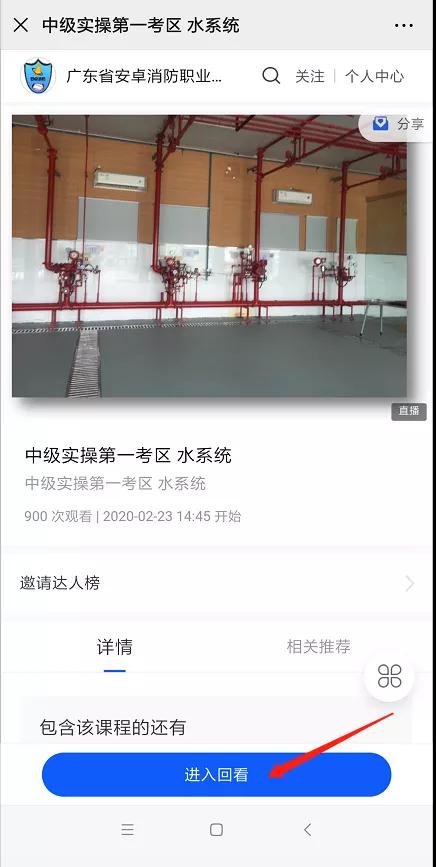 再次进入在线课程步骤: “ 广东省安卓消防职业培训学院 ” 公众号 → 学员天地 → 消防设施操作员在 线课程 → 【旧版】中级实操 →选择课程→ 进入回看
