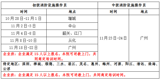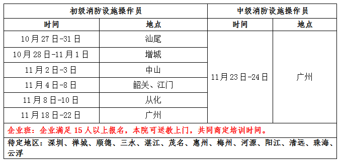 关于 广东省 11月份初(中)级 消防设施操作员 考证培训的 开班 通知