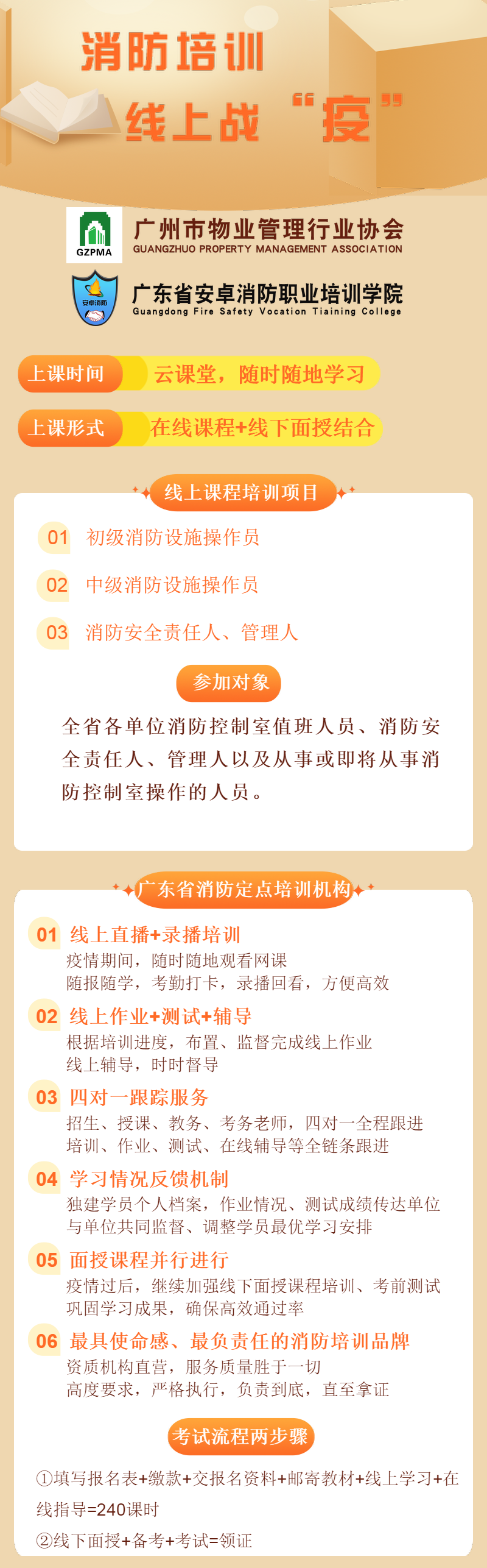 广州市物业管理行业协会与广东省安卓消防学院(我院)共同开展 消防职业培训云课堂。采用线上课程+线下面授的全新培训模式,在疫情防控期间,为奋战在前线的物业学员带来高效便捷的 消防培训课程,共同战“疫”,我们一起行动!