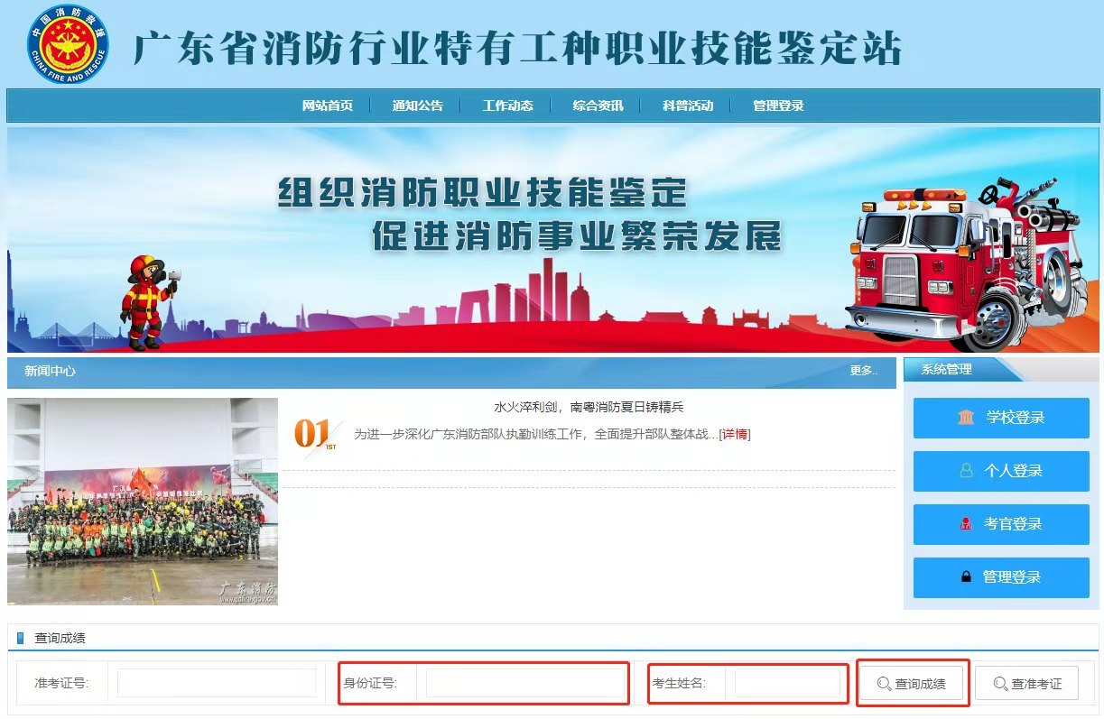 广东省安卓 消防职业培训学院(公众号)-信息查询-国考成绩查询- 输入身份证号和姓名-点击查询成绩